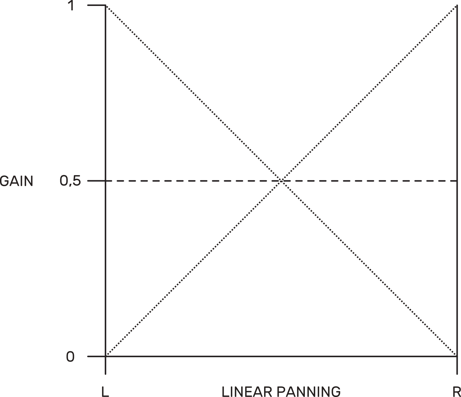 In theory, this would be easily achievable by designing the Pan control to adjust the amplitude of both L and R channels linearly with an inverse correlation so, for example, at the left position, the left channel would keep its maximum amplitude (let's call it 1) and the right channel would be silent (0). As we turn our Pan control to the center, the amplitude of the left channel would start decreasing, and the right channel amplitude would rise in direct proportion to the left channel loss. Once we reach the center position of the Pan control, both channels would have an amplitude of 0.5, summing a total amplitude of 1, so we should not have perceived any volume change, right?