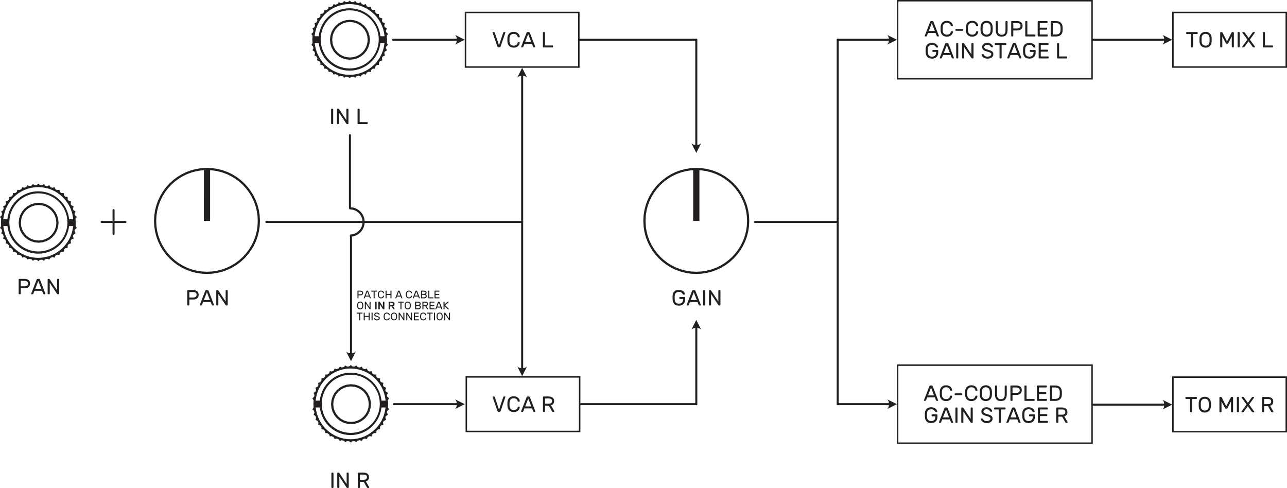 Hive channels are fully stereo and count with independent VCAs and amplification stages for both L and R signal paths. The Pan pot acts as a Balance control when a stereo signal is plugged in. Still, if we use a mono signal instead and plug it into the L input, it will be internally normalized to the R input, feeding both the L and R channels with the same signal, and turning our Pan pot into an actual panning control.