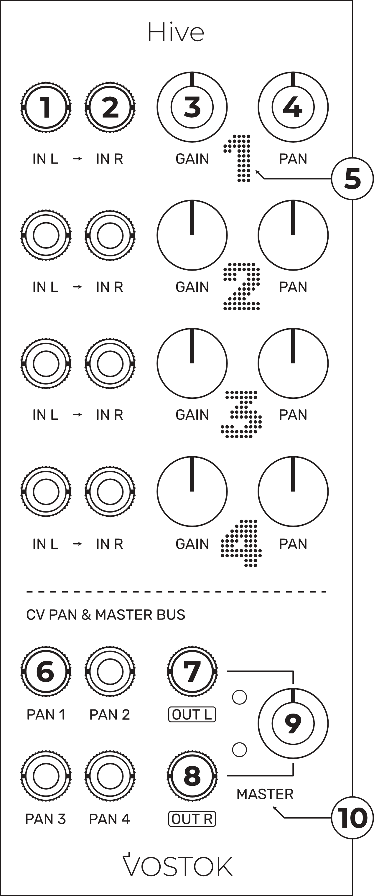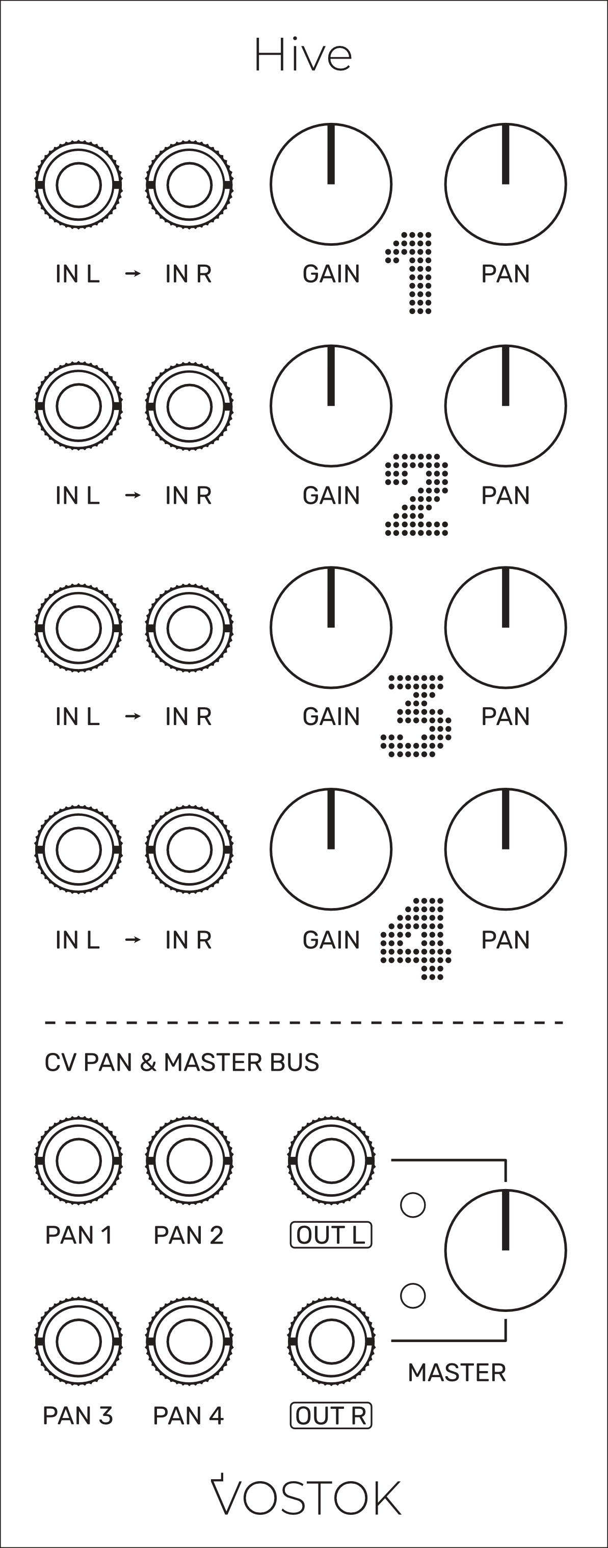 Hive is our take inside the spectrum of Eurorack mixers. At its core, it is a four-channel stereo mixer with CV-controlled panning per channel, but like any other Vostok module, Hive comes with several quirks that make it a handy module for every system.