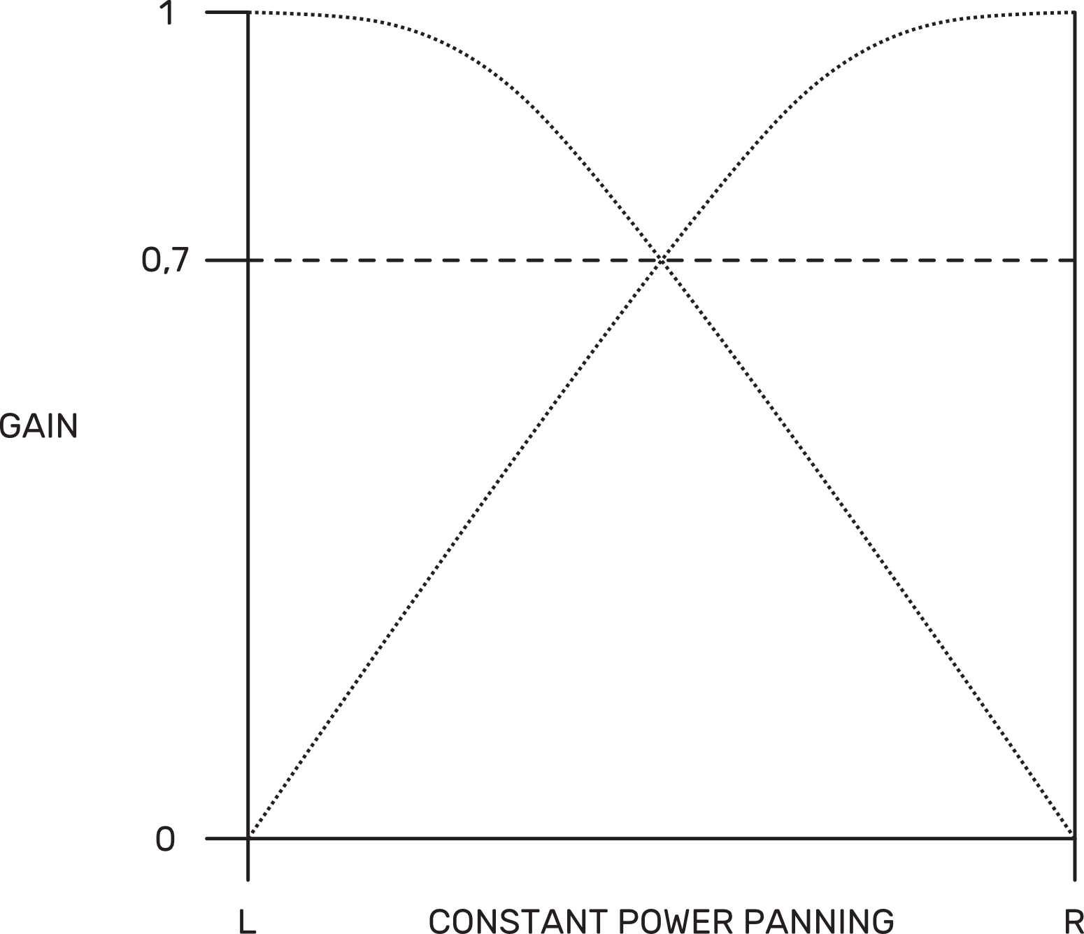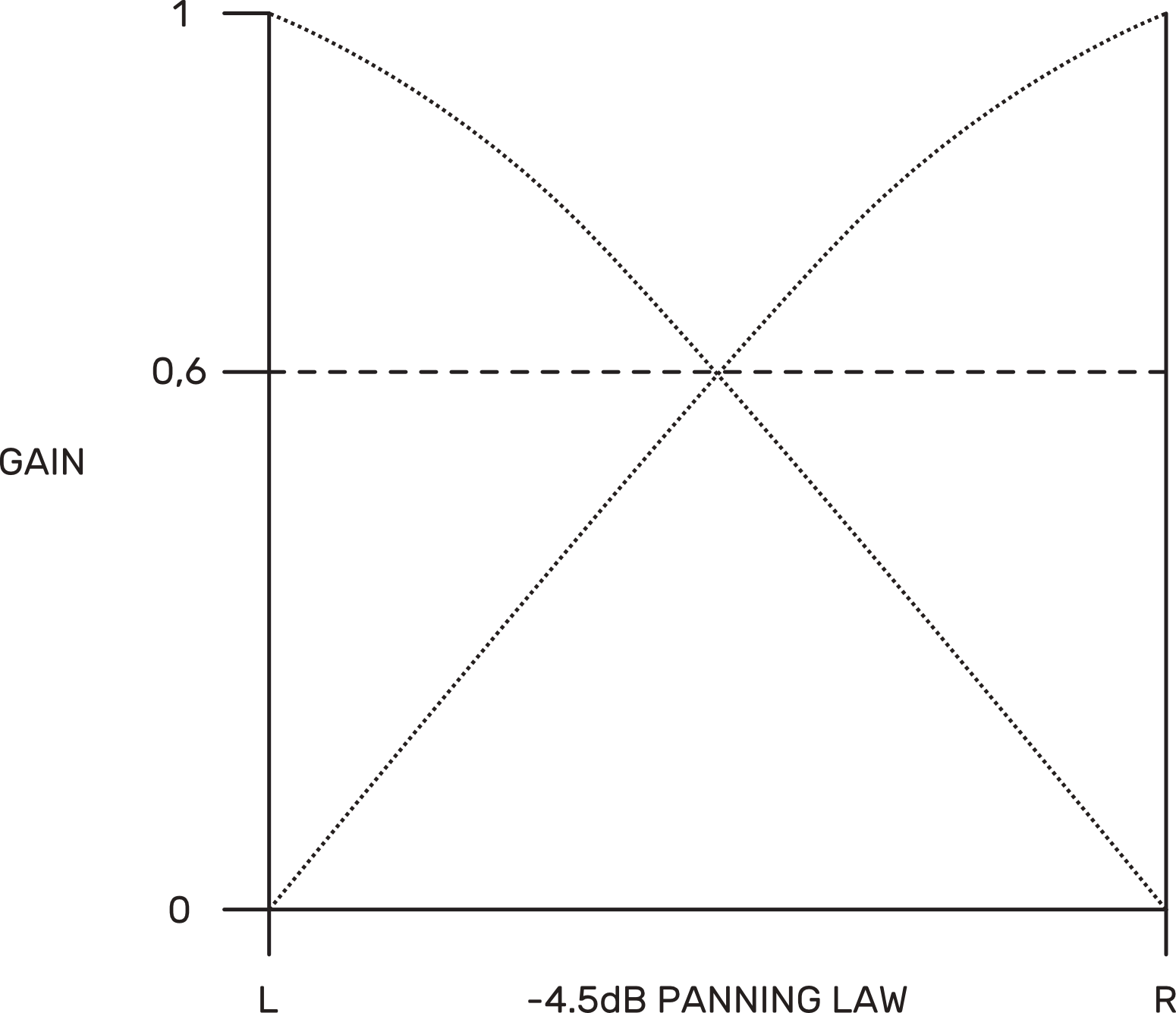 The panning laws are different methods to adjust the volume of the Left and Right channels to compensate for the loudness loss that occurs in the Center when using a linear function, as in the example above (Linear Panning). Most of them imply the use of a different function slope that allows the rise of the intersection point between both channels and compensates for that loss.