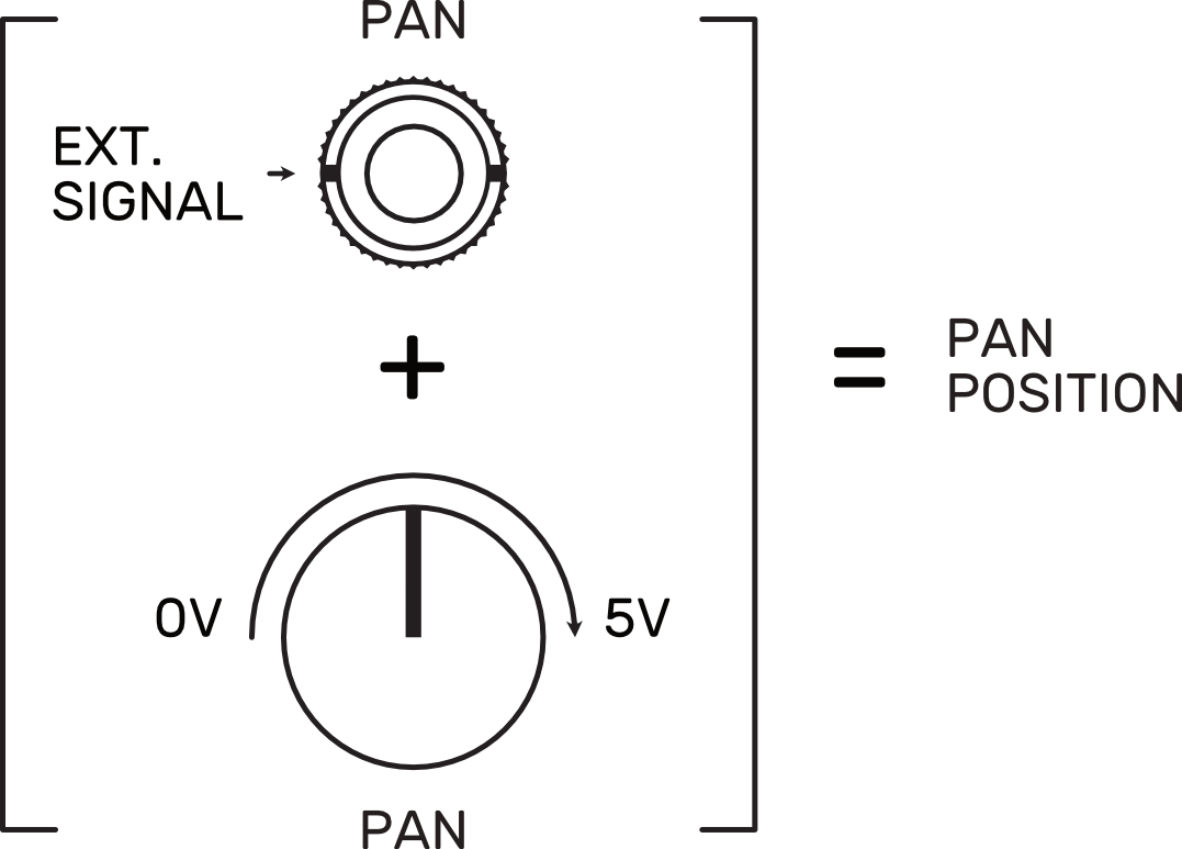 On Hive channels, the panning is controlled by a positive voltage. The relation between voltage and panning is directly proportional, which means that our signal travels from left to right, being left = 0V and right = 5V. The PAN controls of our channels are adjusting the panning by applying different values of positive voltage.